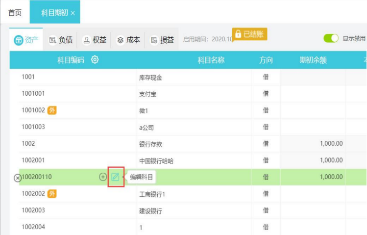 1.在【设置】-【科目期初】,鼠标放到该科目上,点击编辑科目的按钮。