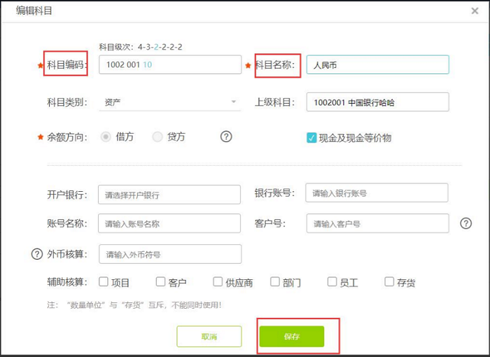 2.在弹出的界面,输入科目编码和名称,点击【保存】即可。