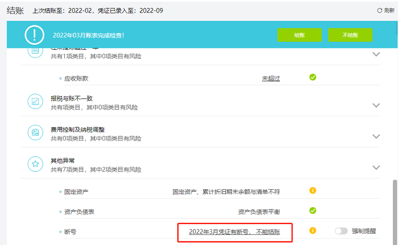 每月月底都要结账,在结账时,点击马上检查后,有提示【2022年3月凭证有断号, 不能结账】,为什么会出现这种情况呢?是否影响结账吗?需要去改吗?