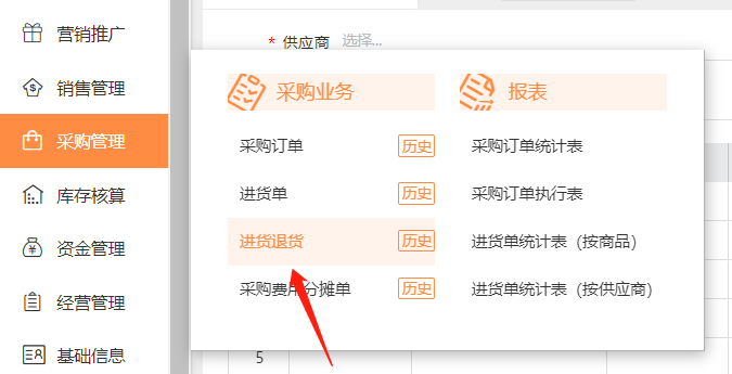 1、点击【采购管理】-【进货退货】进到退货单界面;