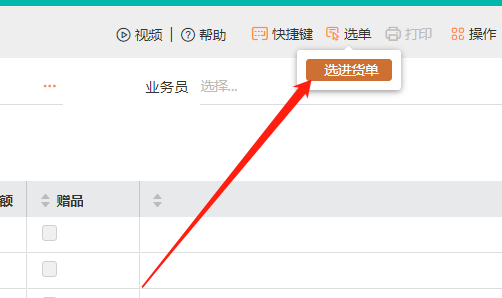 2、右上角点击【选单】,选择相对应的【进货单】,如果只是退货部分,需要在勾选了单据之后,单据明细上仅勾选需要退货的商品。