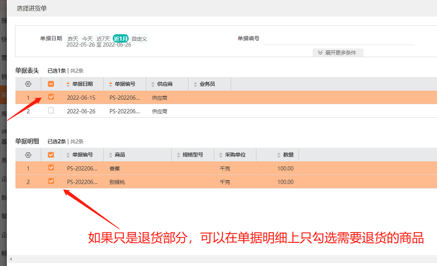 好生意的采购退货如何关联到原单,进行原单退货?