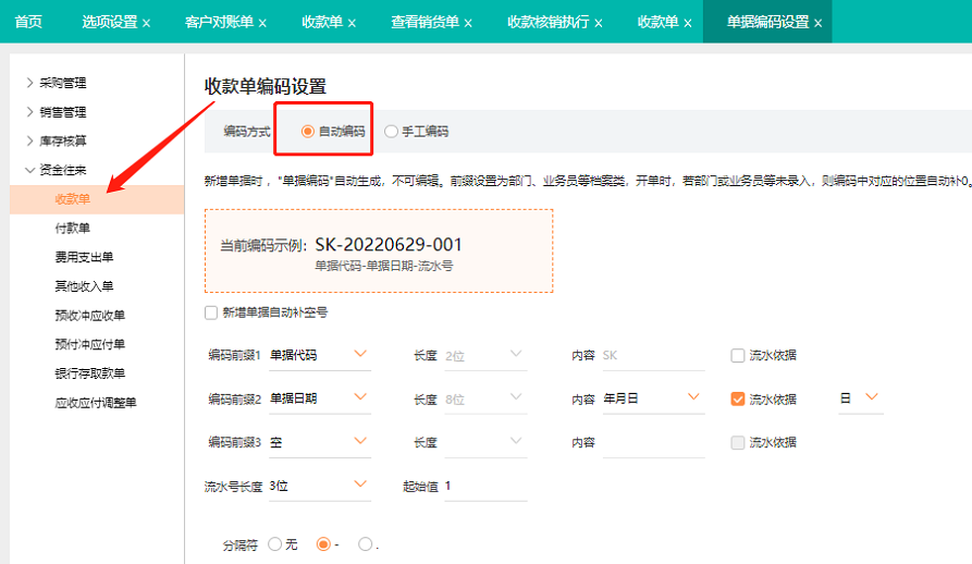 系统单据编码,例如【收款单】的编码是以SK开头,客户希望可以按照自己的需求设置单据编码,放便公司内部查询。