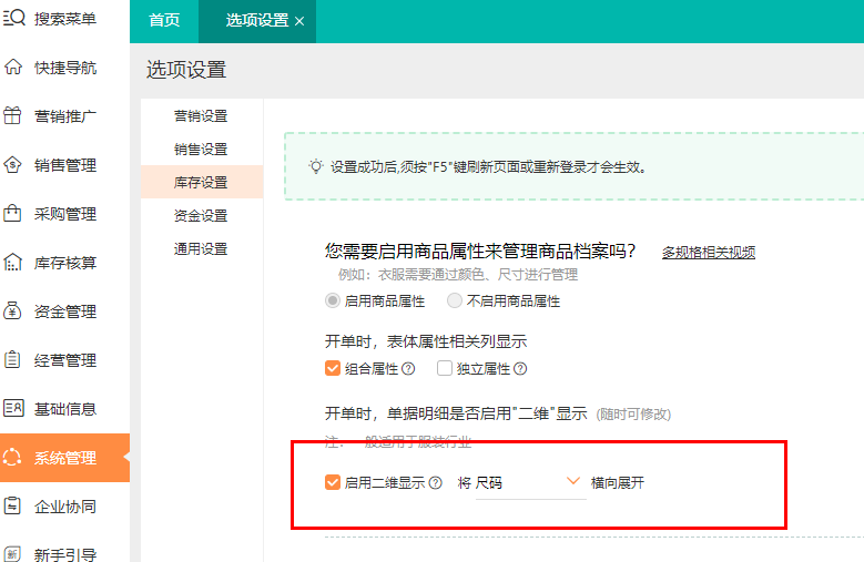 1、进入【系统管理】-【选项设置】-【库存设置】,勾选启用二维显示,按照需要选择将哪个属性进行横向展开。