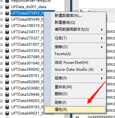 3、 查看要移动账套的位置:在 sql server 中选中要移动的账套数据库,右键属性