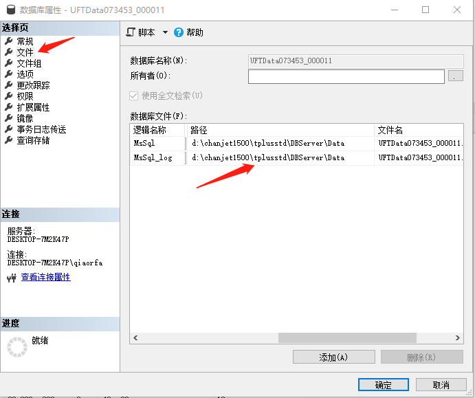在弹出的属性页中选中文件页,可以查看数据库文件路径。确定文件的位置。