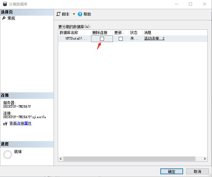 分离界面如下,如果分离不成功或者数据库有其他链接,可以勾选删除连接选项,然后点击确定按钮。
