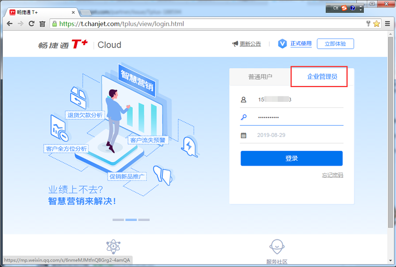 1、使用企业管理员账号登录T+Cloud。