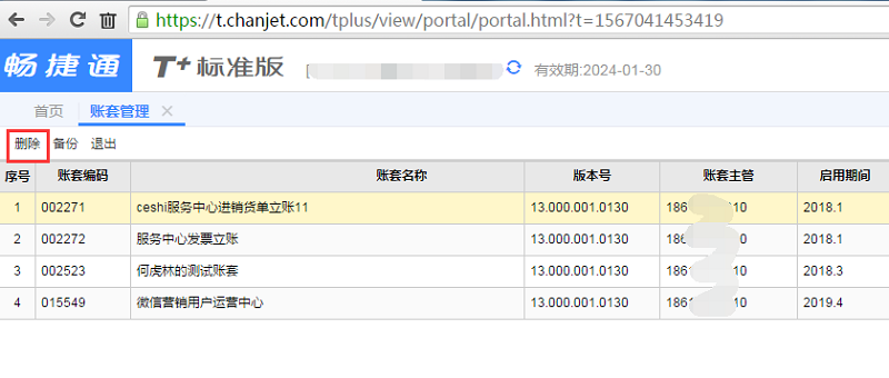3、选择需要删除的账套,点击【删除】按钮。