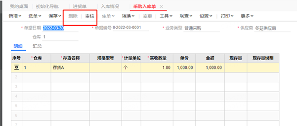 3.将进货单弃审,同理,如果销售出库单也出现删除是灰色的,单据又是未审核状态,也是因为选项中勾选了销货单自动生成出库单。将销货单弃审即可。