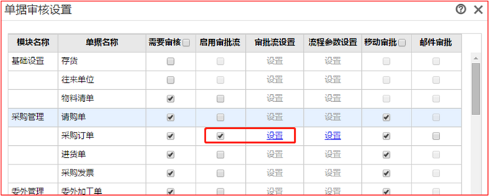 2、在【系统管理】-【单据审核设置】中,为采购订单启用好审批流,并在流程中,以含税金额作为判断条件。