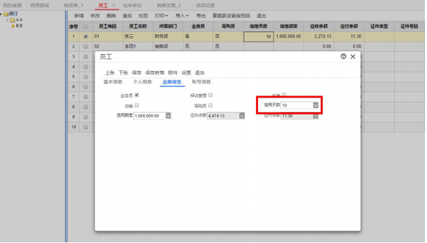 员工信用期限控制的计算是在收款到期日的基础上再加上员工信用天数得到员工信用期限,按照这个期限日期判断是否有超期应收款,新增业务的单据日期在此日期之后则受期限控制,该日期之前的业务不受期限控制,依旧可以新增。