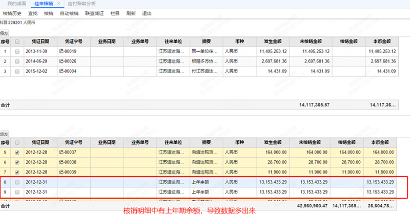 应收账龄分析表科目220201对应往来单位与在辅助余额表查看余额对不上,查看往来核销发现有多条上年期初不知道怎么来的,无法对应核销。