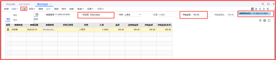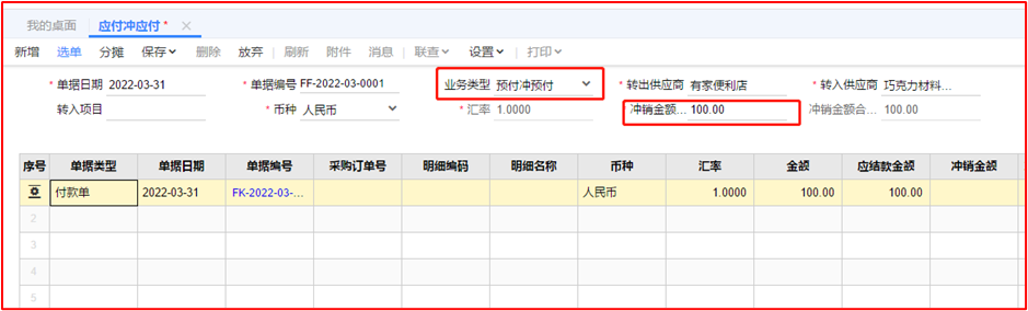 2、【往来现金】-【预付冲应付】中,进行转入供应商的正常核销