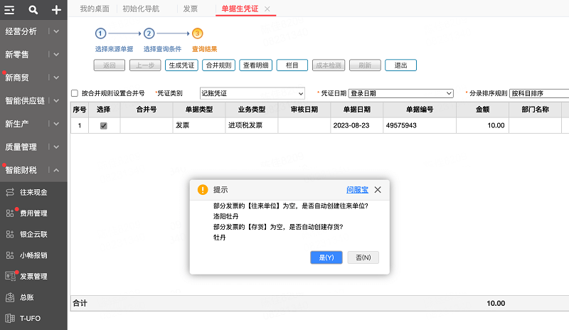 发票生凭证时,如果选项设为是且发票抬头/商品尚未匹配往来单位/存货档案,则询问是否自动创建档案;