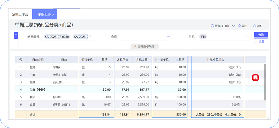 场景1:调度人员按司机车辆或线路汇总销售单据,打印出来给到仓管员拣货。拣货时需将相同商品汇总,且要知道每个商品是几大几中几小(单位),方便取货;拣货完后按大中小单位合计量清点实物与司机交接。