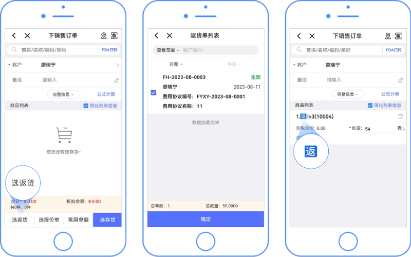 二、下单时,点击左下角的【返货】按钮选择该客户生效未执行的返货单进行返货