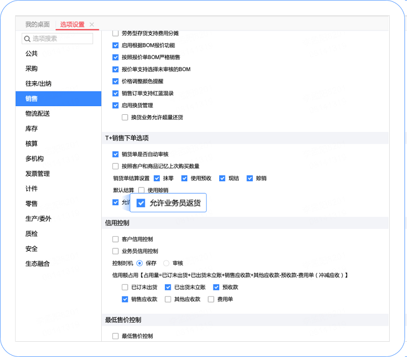 一、选项设置:在销售选项中启用【允许业务员返货】的移动端选项;