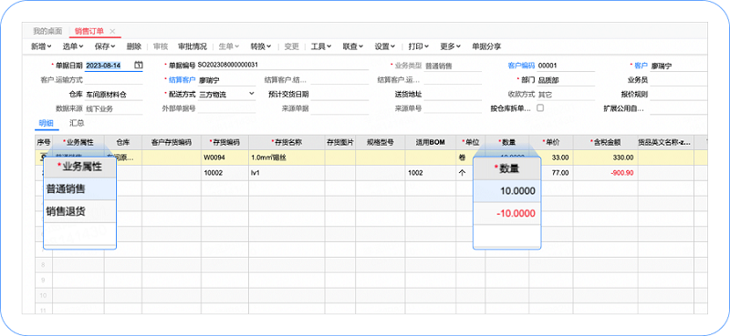 1)PC端,做销售订单/销货单时,业务类型选择【普通销售】。选择商品录入数量,退货录入负数,销货录入正数;
