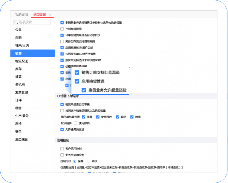 一、选项设置:在销售选项中启用【销售订单支持红蓝混录】和【换货管理】业务;