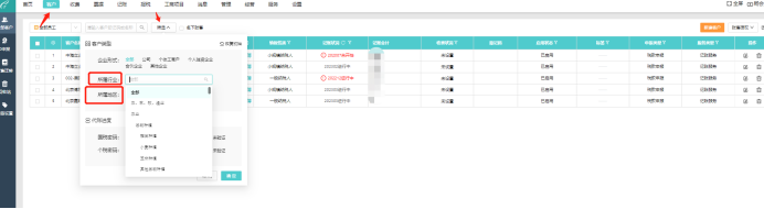 易代账客户筛选,所属行业、所属地区下拉框支持搜索。