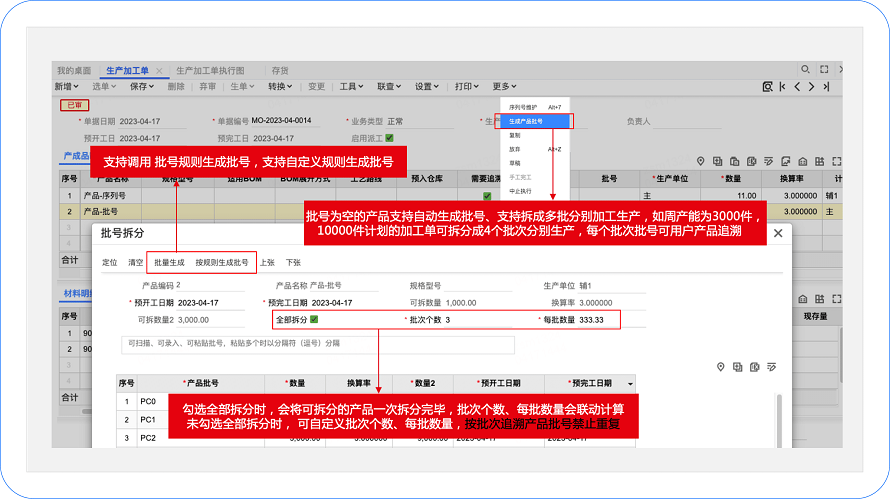 加工单下达任务量较大,不能一次完成生产,需要按产能对计划加工数量进行批次拆分,每个批次分别派工生产,方便按产品批次进行质量追溯及生产管理 。