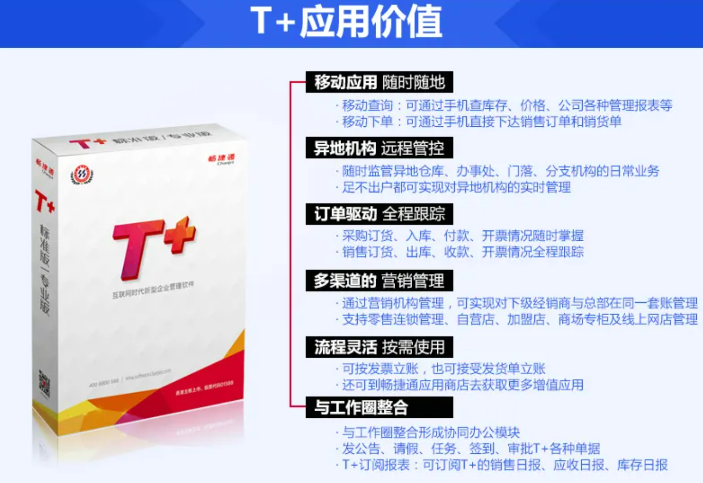 用友T+ 是一款基于互联网的新型企业管理软件,在满足企业本地业务管理需求的同时,还可帮助企业进行异地仓库、办事处、门店、分支机构的远程管控。用友T+财务软件同时融入了手机移动应用,方便企业人员通过手机下订单、审批、查询业务数据。T+具备协同OA平台功能,支持移动端费用审批、采购申请、费用报销、请假、移动考勤等。官网功能介绍,手机注册即可试用:https://tcloud.chanjet.com/)。
