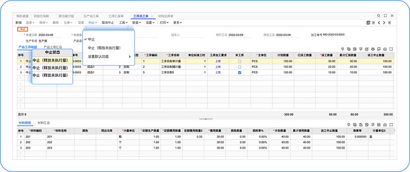 对于当天未完成且第二天需要重新派工的工序派工单进行“中止(释放未执行量)”,系统会根据当前工序派工单的累计汇报数量更新派工单的派工数量,将未执行的派工数量和材料未领用数量转回上级生产加工单。