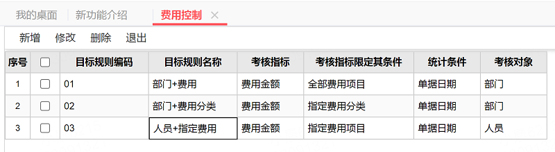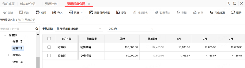 在“费用控制”功能中,支持针对部门、人员按照费用分类、费用项目进行费用额度的设置,并可实时查看费用额度的达成情况。
