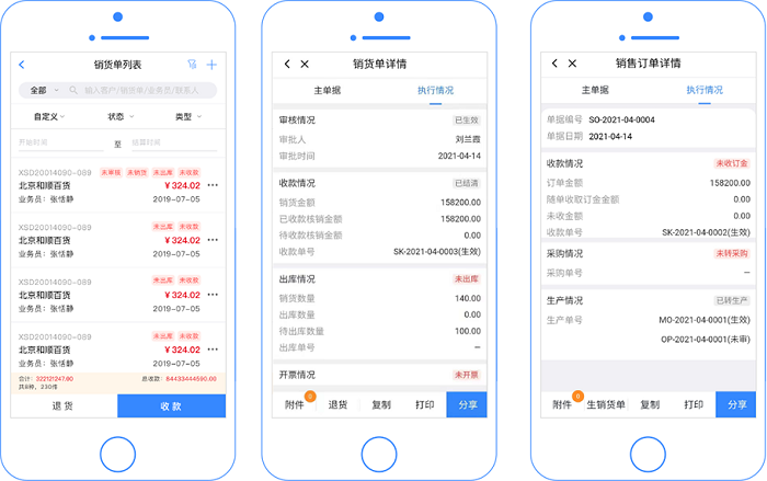 手机端,在T+销售下单,可以直接在单据详情中查看执行情况。