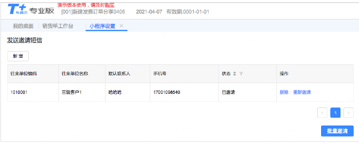 给需要的客户发送邀请,下发登录微信小程序(畅捷通TPlus)的密码,客户可以在线查看自己的单据。