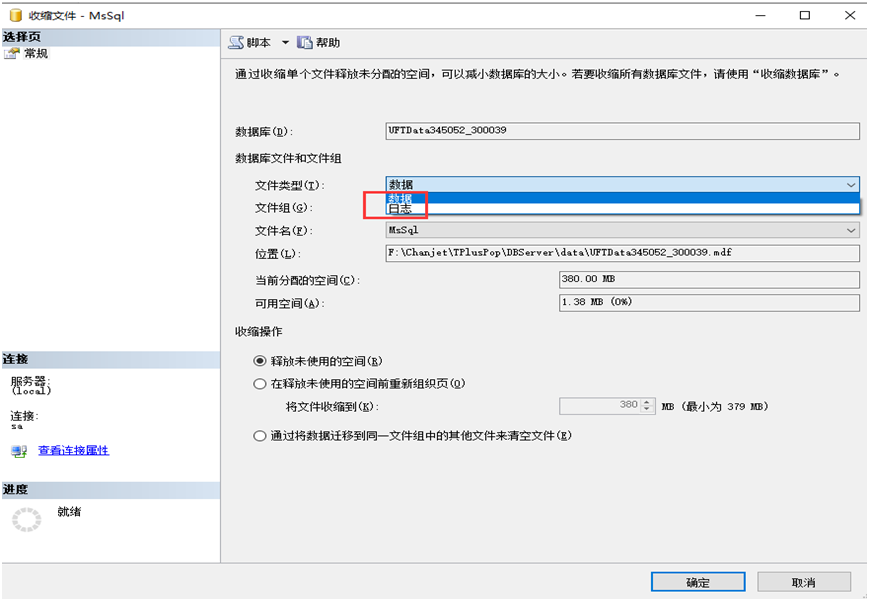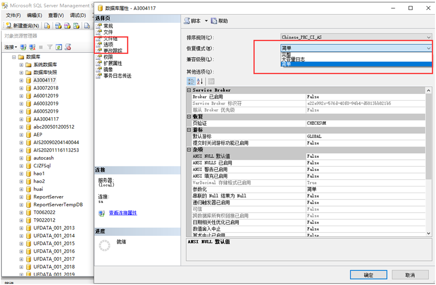选择要收缩的数据库—右键属性—选项—将恢复模式从“完整”改为“简单”—确定,如果数据库是简单模式默认就不用修改