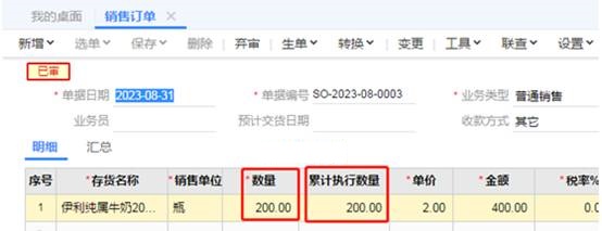 1、进入销售订单界面,可以看到订单数量是200,累计执行数量是200,也就是这个订单的货已经发完了。