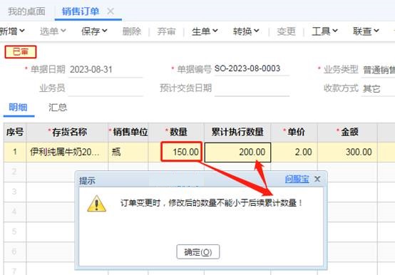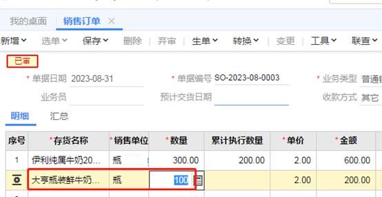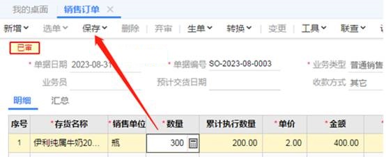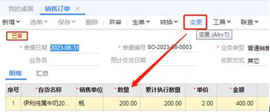 2、不允许弃审,通过“变更”来处理,客户说订单数量需要再加100瓶,点击“变更”,原来数量为200再100,也就是数量处录入300并保存,如图下操作: