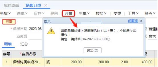 当我们点及弃审,提示:当前单据已被下游单据执行(见下表),不能进行此操作!如图下:
