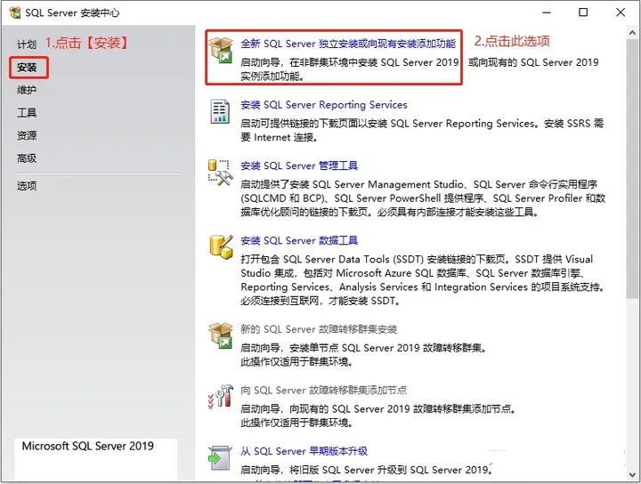 3)点击【安装】,在右边窗口点击【全亲SQL Server 独立安装或向现有添加功能】