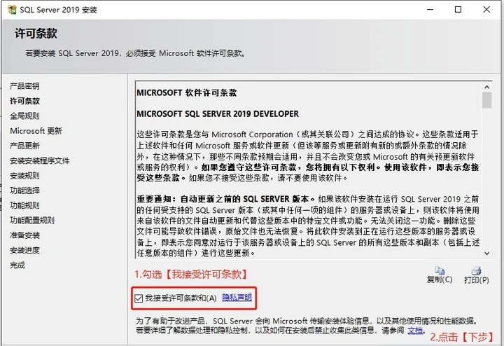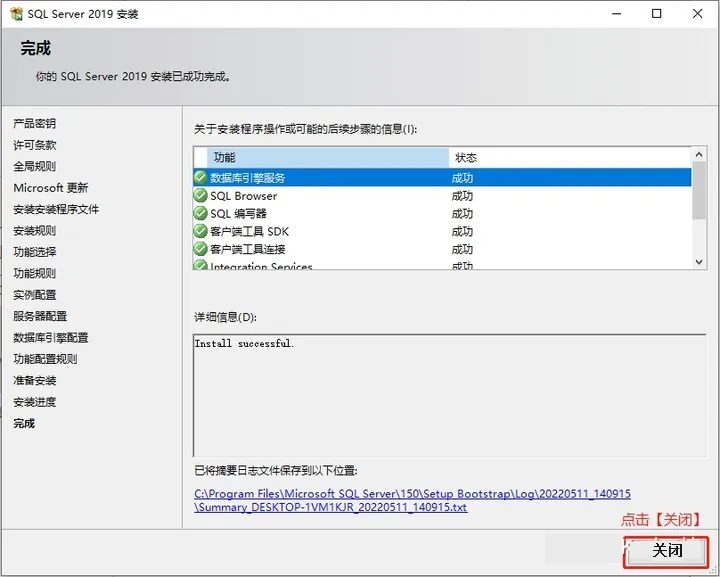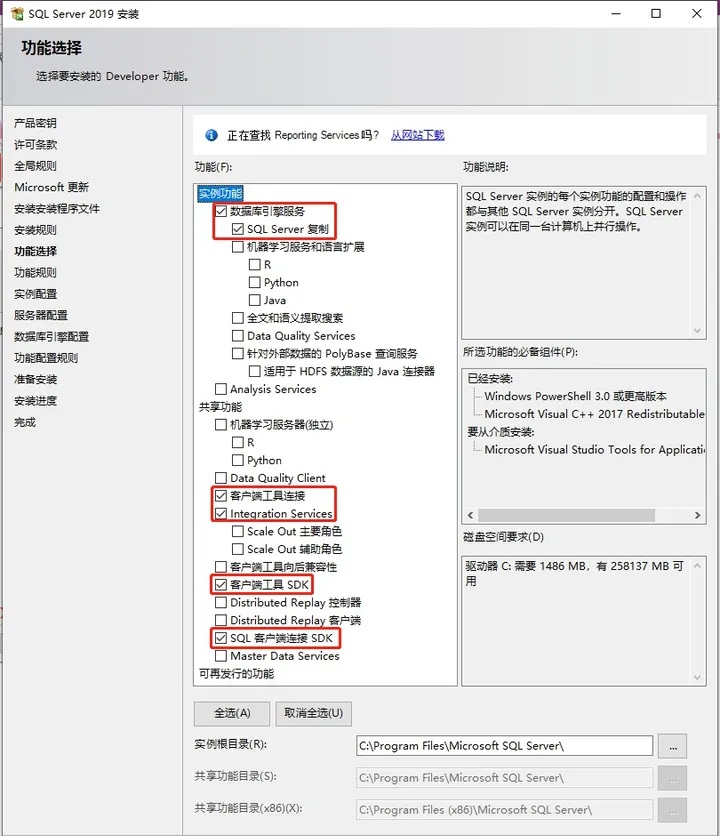 8)勾选【数据库引擎服务】【SQL Server复制】【客户端工具连接】【Integration Services】【客户端工具SDK】【SQL 客户端连接SDK】,点击【下一步】