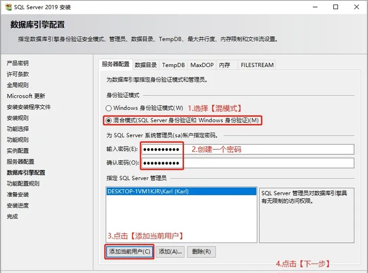 11)选择【混合模式】,创建管理员密码,点击【添加当前用户】等待添加成功后,点击【下一步】