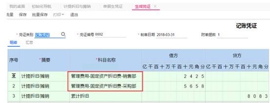 4、最后来生成凭证,系统按比例算出各部门的累计折旧,如图下: