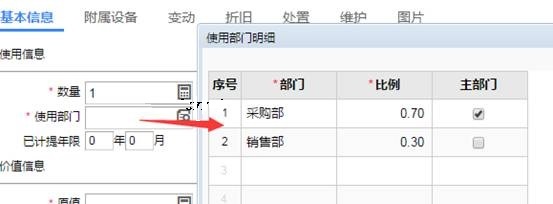 2、在图上使用部门处,录入相应的部门与比例,如图下: