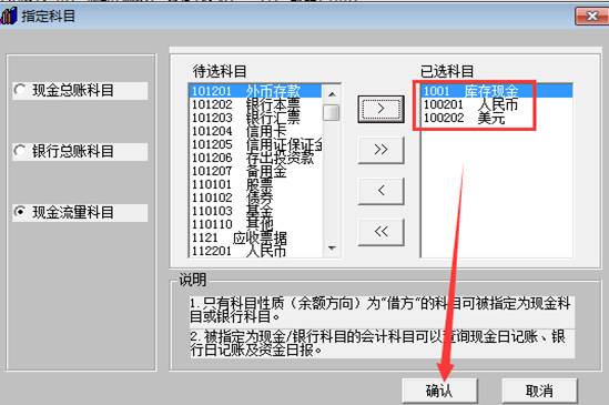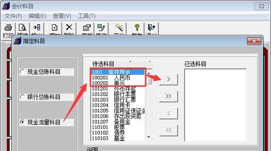 点击现金流量科目,选择待选科目(库存现金与银行存款),再点击向右的箭头并确认,如图下操作: