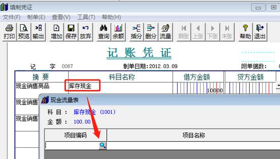 4、填制凭证,当录入库存现金或者银行存款等现金流量科目时,自动跳出现金流量表界面,选择对应的现金流量项目并保存,如图下操作: