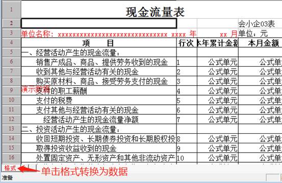 6、现金流量表模板生成后,单击左下角格式即转换为数据,因为数据状态下才可以取数