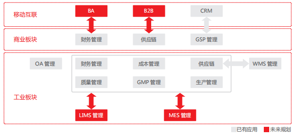 当前,U8+ 作为企业管理核心信息系统,其供应链、生产、GMP、GSP、财务管理、成本管理等全面上线应用,并且已和 WMS 系统进行无缝对接,各环节业务实现数字化管理,生产效率得到了大幅提升。未来将与 MES 系统和 LIMS 系统进行对接,向智能化方向发展。