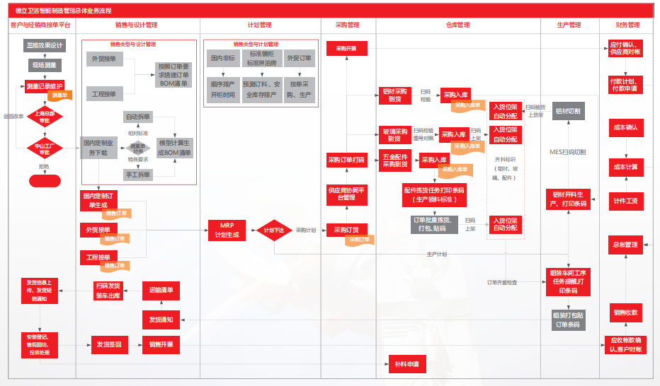中山德立卫浴信息管理应用实现了线下测量、线上下单,企业接收、快速设计、设计标准自动转化业 务标准以及业务单据同步生成,仓库和生产车间结合业务指令及批次信息,扫码办理出入库作业和生 产上线作业,规范业务与实物同步化处理和管控。中山德立卫浴信息化成功经验,值得较多的生产制 造企业学习和借鉴。
