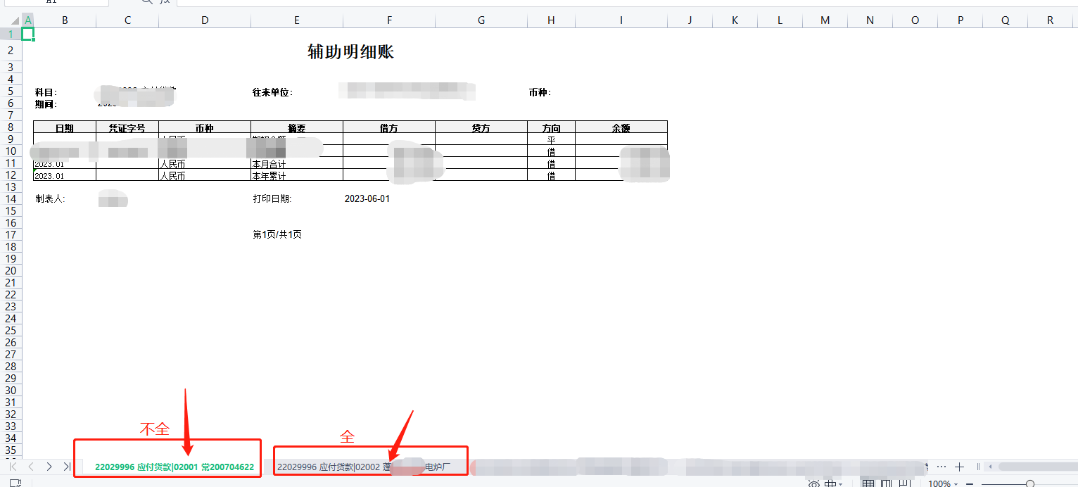 用友T+产品中的辅助明细账查询,导出时sheet标题客户名称不全