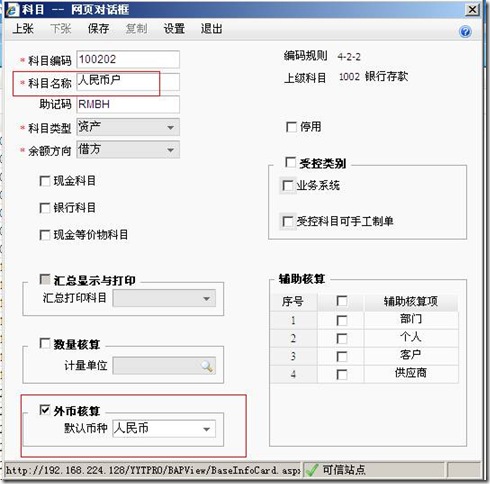 4. 将涉及到外币的科目挂上外币辅助核算(“基础设置”-“财务信息设置”-“科目”):