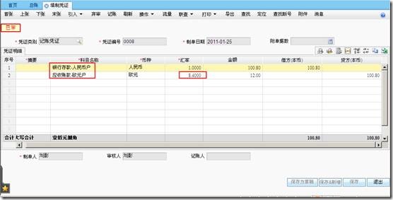 2、1月25日收到人民币,当日市场汇率为8.4,针对应收账款-欧元户进行“汇兑损益结转”:(“总账”-“自动转账”-“汇兑损益结转”),调整金额-1.2=12欧元*8.3-12欧元*8.4