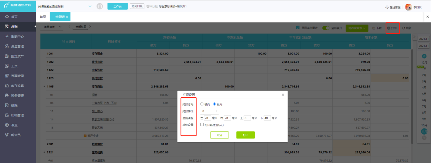 点击【打印】可以将余额表打印出来,目前可以根据需要选择打印设置(包括打印方向、打印字体、边距调整和其他设置)。