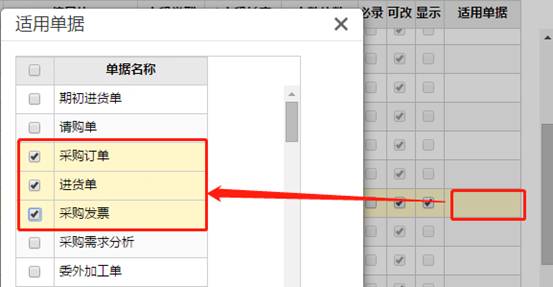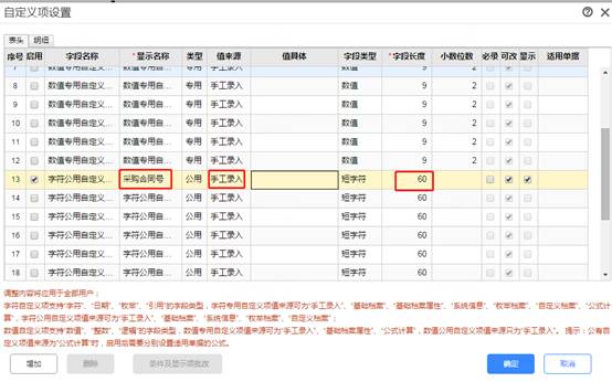 5、然后把显示名称改为“采购合同号”,值来源选为手工录入,字段长度可默认,然后再选择适用单据,勾选采购订单、进货单、采购发票并确定保存,如图下操作: